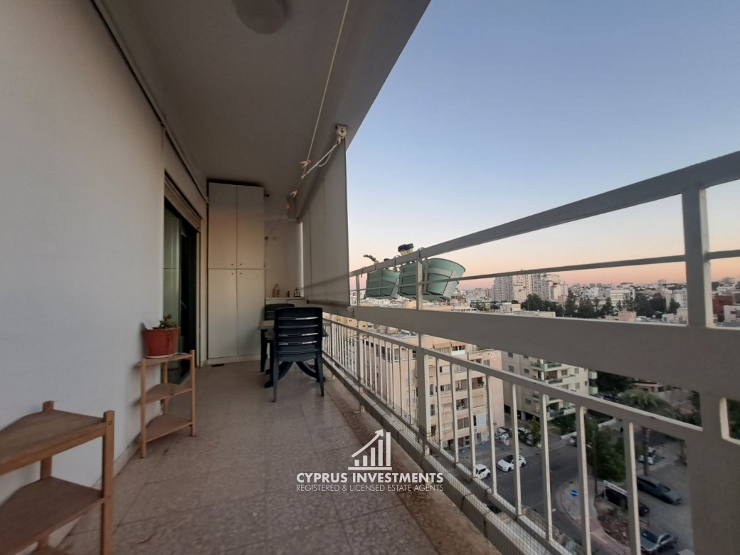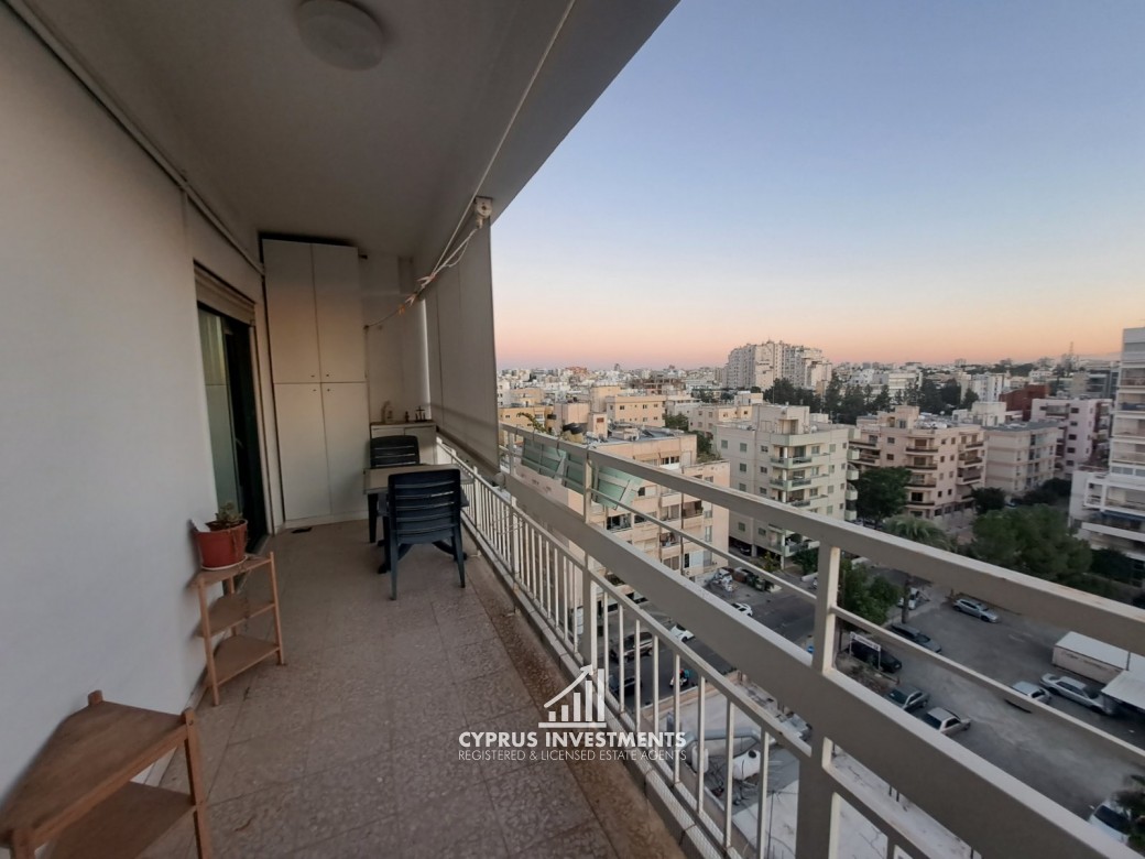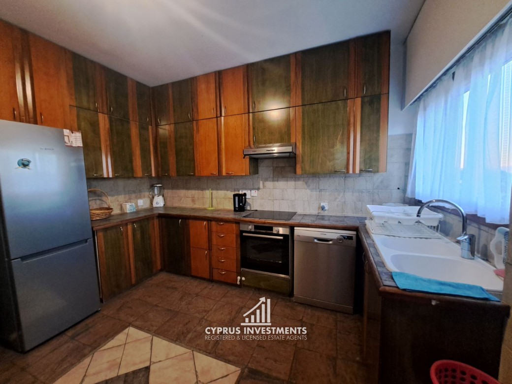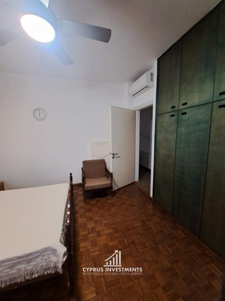 Two-bedroom spacious apartment in Agioi Omologite for rent, the property consists of a spacious living area with a covered veranda, a fully equipped kitchen, two bedrooms, and one bathroom.