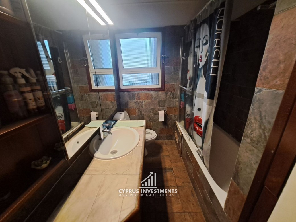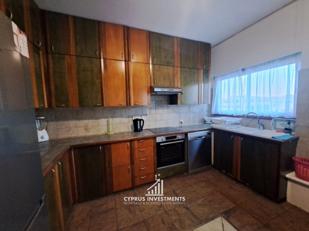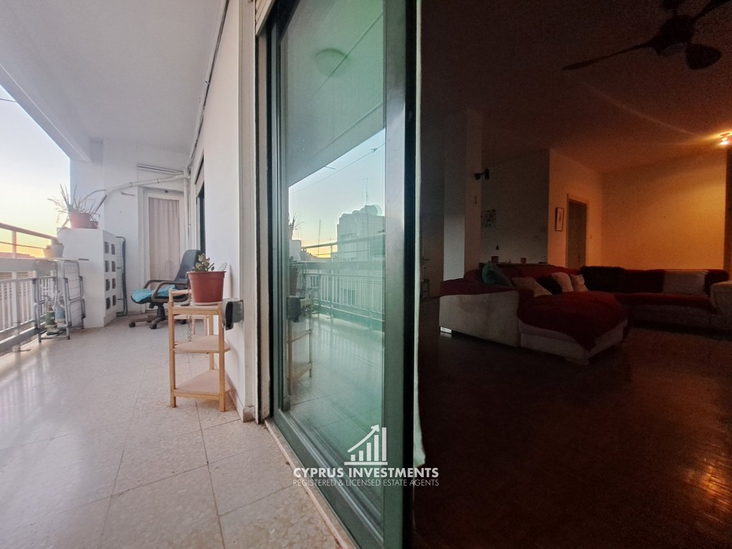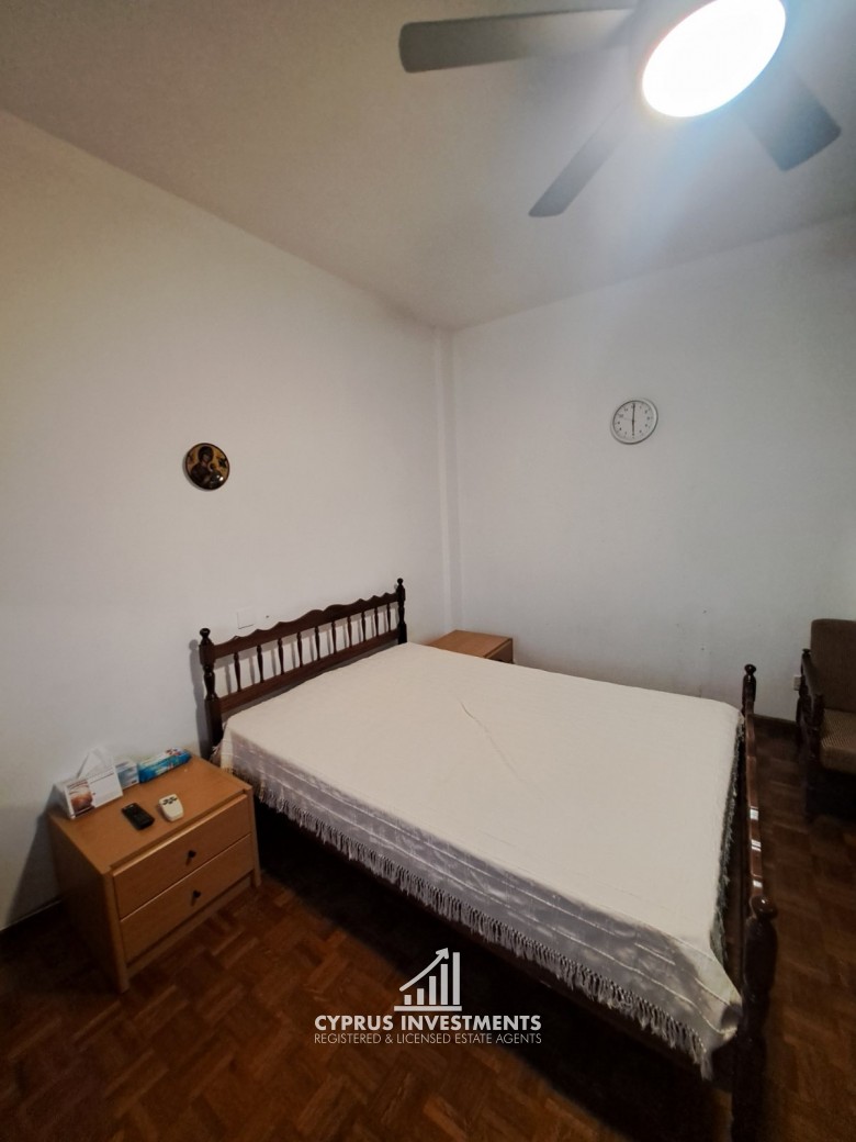 Two-bedroom spacious apartment in Agioi Omologite for rent, the property consists of a spacious living area with a covered veranda, a fully equipped kitchen, two bedrooms, and one bathroom.