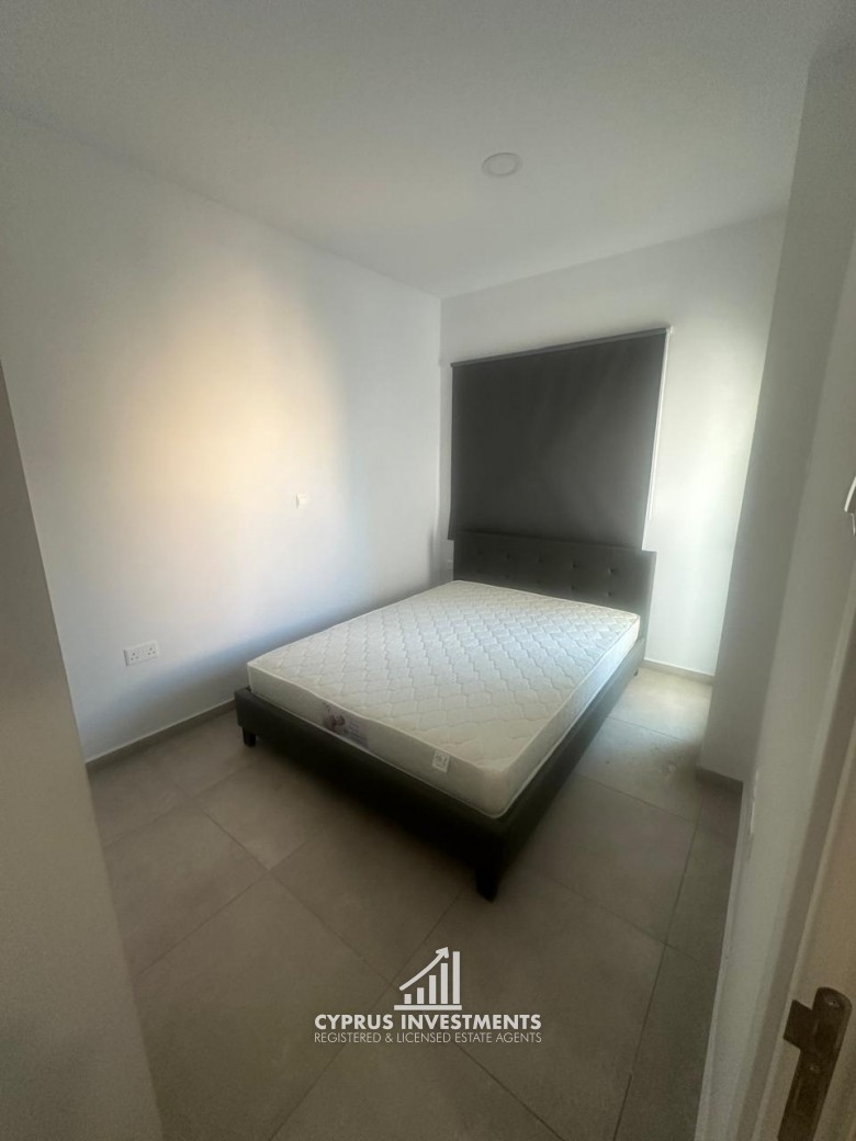 One-bedroom apartment in Egkomi for Rent consists of a living area combined with a fully equipped kitcken, one bathroom, one bedroom, and a small veranda.