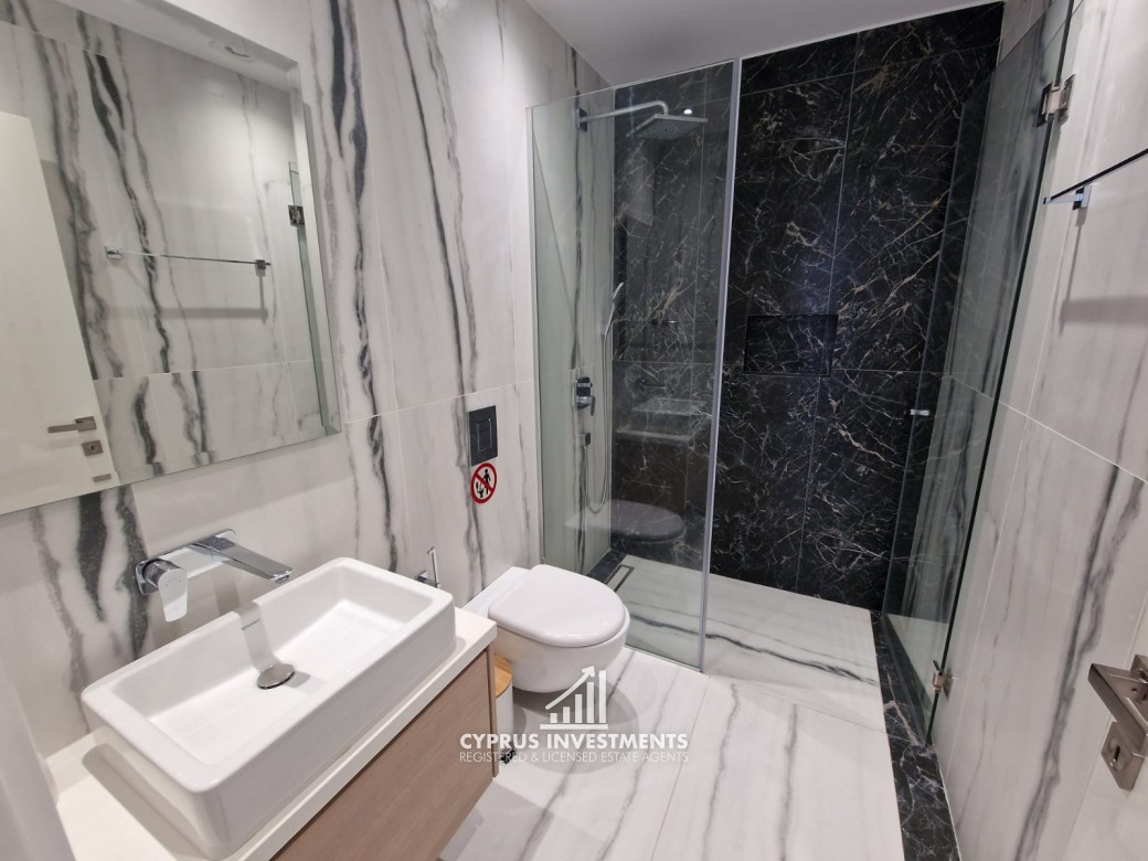 The bathroom is a testament to thoughtful design, with its pleasing aesthetics and a refreshing shower that promises rejuvenation.