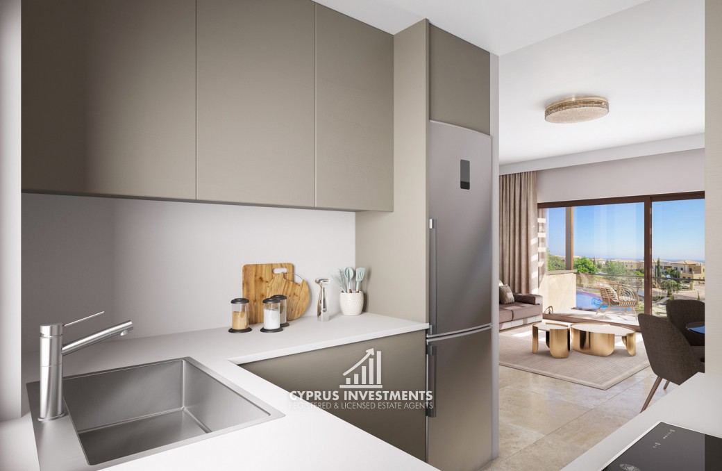 These beautiful, spacious apartments are set in 3-storey buildings with just 6 homes to each unit and share wonderful views over the large free-form communal swimming pool, golf academy and the glistening blue Mediterranean Sea. Located in a prime position at the center of Aphrodite Hills Resort, each apartment block boasts an uncompromising attention to detail that is synonymous to the high-end real estate choices offered at the multi awarded Resort. The apartments boast the highest quality Italian-style kitchen units, lavish Crema Royal Marble bathrooms, marble or parquet flooring throughout and concealed dual air conditioning/heating system. Apartment owners and their guests have exclusive access to beautifully landscaped gardens and the free-form swimming pool. The covered area of the property is 105.30 sqm, veranda is 19.90 sqm and the total covered area is 125.20 sqm Licensed and Registered Agency R.N 1106 , L.N 151/E.