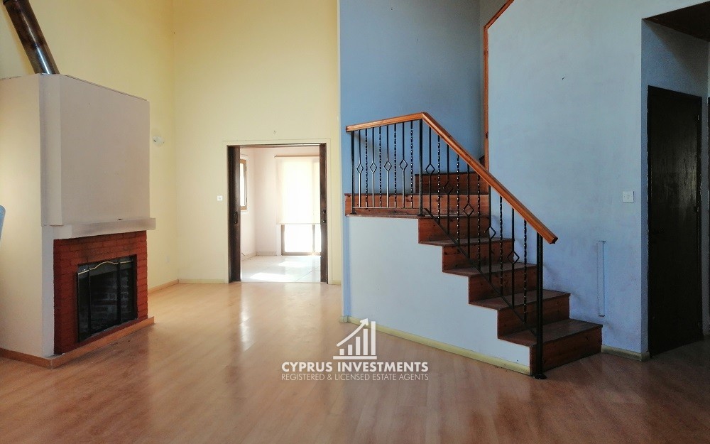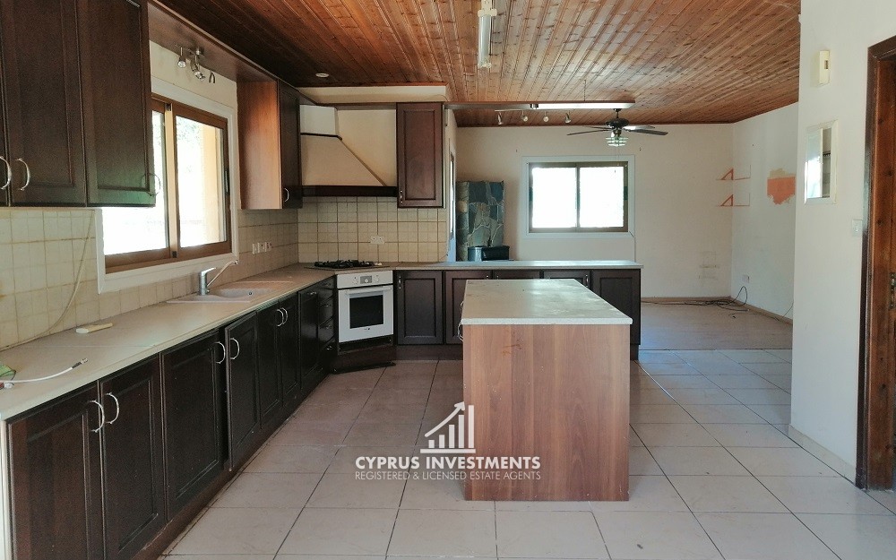 The property has an area of 220sqm. It comprises of an open-plan living room and kitchen area, a dining area, a service room, a laundry room, an office and two storage areas on the ground floor. The first floor comprises of three bedrooms (one is en-suite), a small storage area and a bathroom. The house has ceramic floors in all areas, laminated parquet in the bedrooms, double glazed windows, four split units and two fireplaces installed. Externally there is a paved veranda with a pergola and a covered parking area.