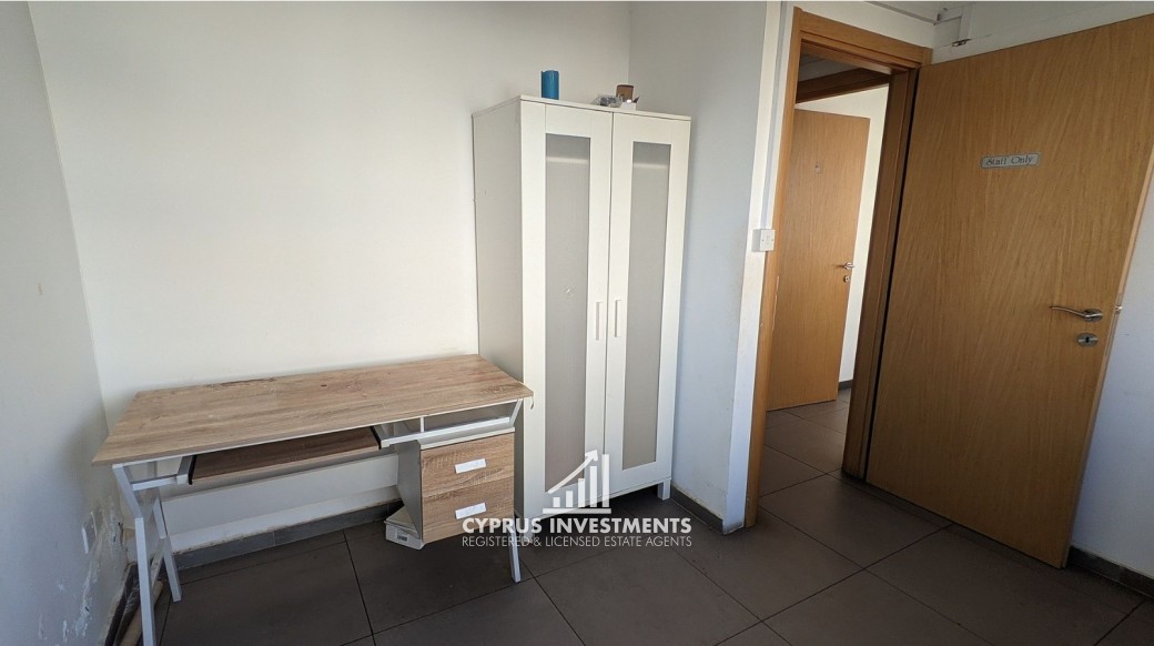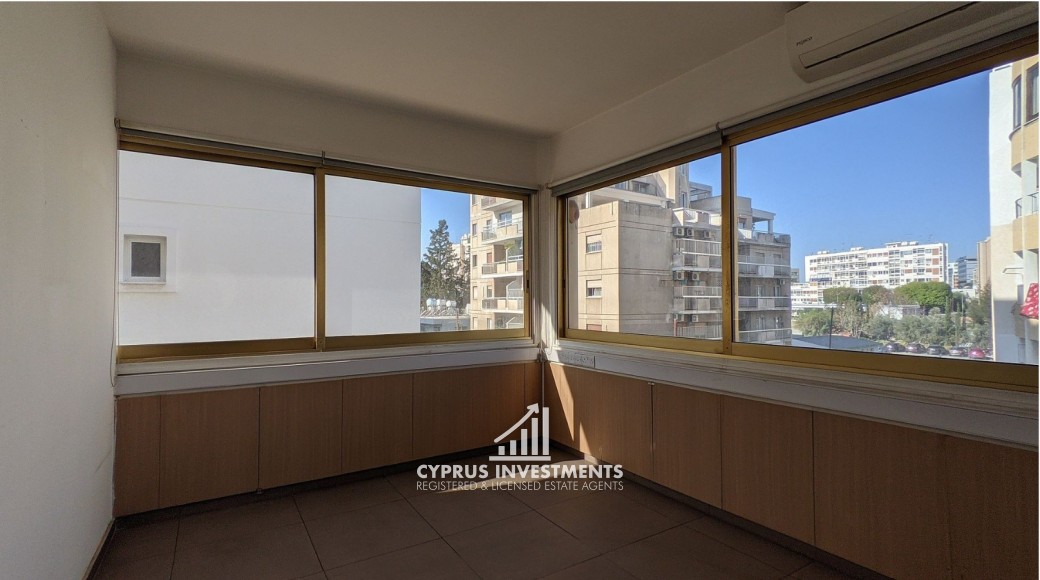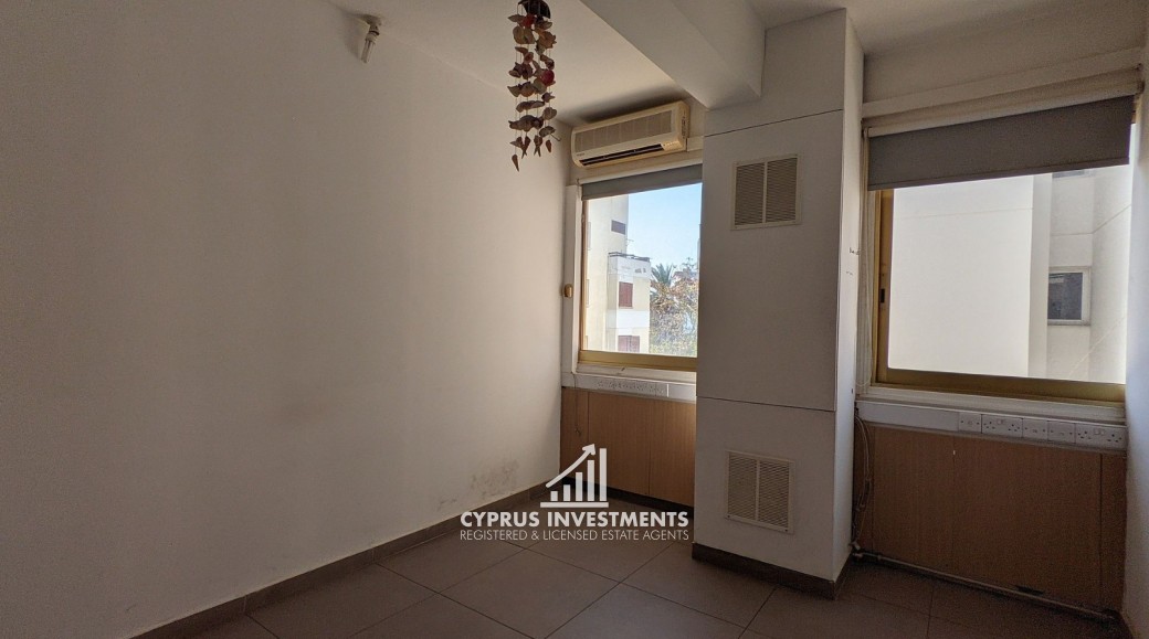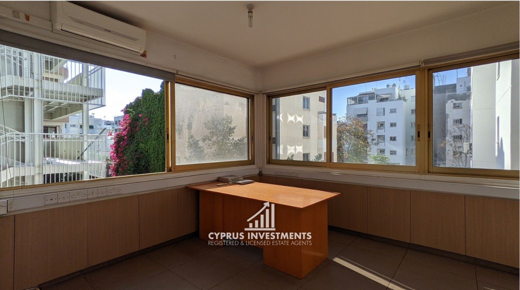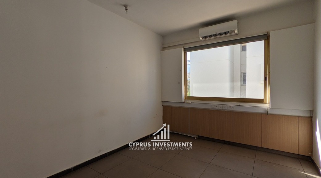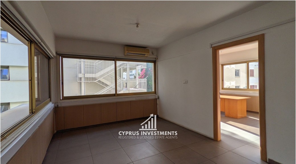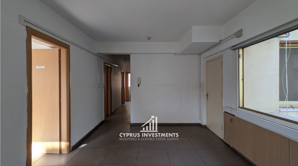 Office unit situated on the second floor of a five-story commercial building, ideally located in Nicosias' commercial center in Agioi Omologites, Nicosia. The office consists of a reception area, a kitchen, 5 office spaces and two (2) toilets and 1 shower. The asset is located near the city center, approximately 1km to the motorway and 325m southwest of the Nicosia police station. The property falls within Zone Eβ3, with a building coefficient of 160%, coverage of 50%, and permission for 6 floors (24m) of construction.